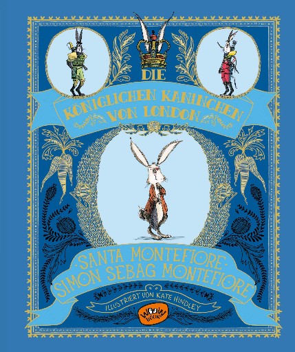 In der Mitte sieht man Shylo, der ein wenig zaghaft in die Welt zu blicken scheint und oben zwei der königlichen Kaninchen von London. Und auch der Klappentext auf der Rückseite ist mit Gold umrahmt und man findet noch einige andere Charaktere, die in dem Buch eine Rolle spielen.